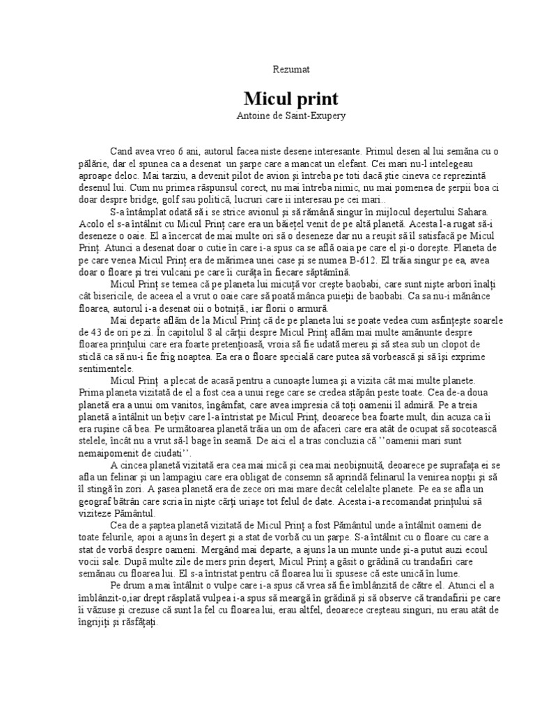 Micul Print Din Fiecare Om Rezumat Pe Capitole Source from : https://ro.scribd.com/doc/131954059/MICUL-PRINT-Din-Fiecare-Om-Rezumat-Pe-Capitole Performanţe crescute pentru elevii din învăţământul preuniversitar. Aici începe călătoria magică şi emoţionantă a fetiţei în universul micului prinț. Referate scoală aranajate pe categorii. În acest mod fetița își redescoperă copilăria şi învaţă că cel mai important lucru este să ai prieteni şi să înţelegi esenţialul. Capitolulacela, îşi zise micul prinţ mai tîrziu, pe cînd îşi urma călătoria, ar fi rău privit de toti ceilalţi, de rege, de vanitos, de betiv, de omul de afaceri.