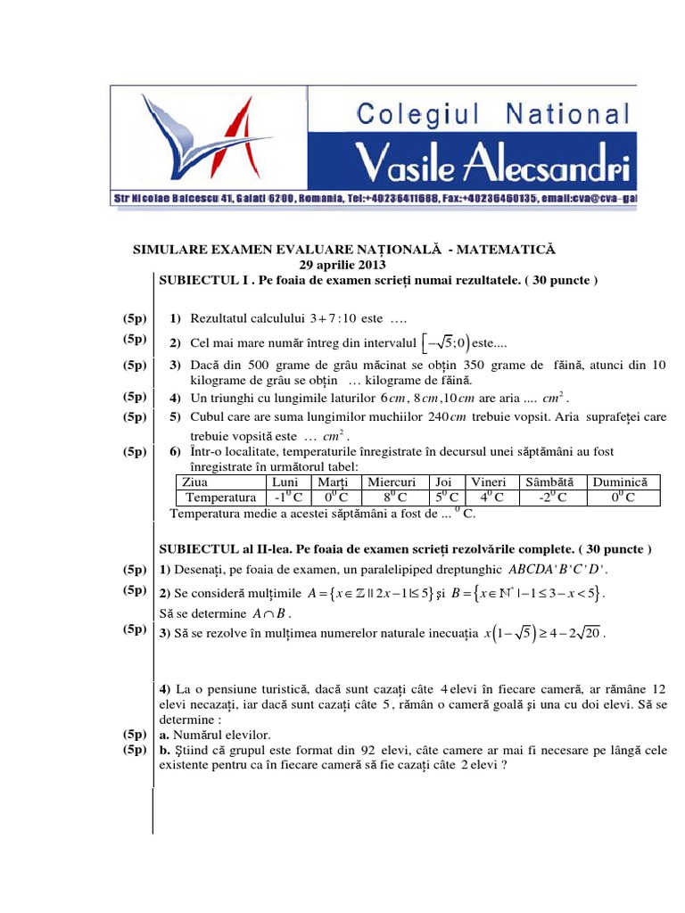 Subiecte Simulare Evaluare Nationala 2019 Proba La Matematica Clasa A Vii A Source from : https://www.examenultau.ro/blog/subiecte-simulare-evaluare-nationala-2019-proba-matematica-clasa-7/ Martie 13, 2020 by corina turcanu. Simularea evaluării naționale 2019 pentru elevii din ultimii ani de gimnaziu continuă. Culegerea este structurata in doua mari capitole: Profilul tehnic, toate calificările profesionale • toate subiectele sunt obligatorii. To translate any content of this site scroll down to the end of the page!