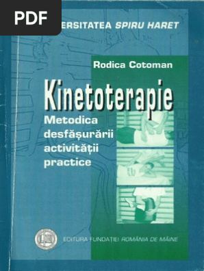 vizitati articolul complet aici : https://www.slideshare.net/CRYSSCRYSSNicoarea/40501329-ghidpracticdeevaluarearticularasimuscularainkinetoterapie2 Are la bază mișcarea efectuată prin programe de recuperare medicală bine structurate, ce au ca scop refacerea unor funcții diminuate. Kinetoterapia are la bază, deci, modul de funcționare al mișcărilor umane, implicând atât componenta musculară și articulară, cât și pe cea neuronală. Kinetoterapia face parte din medicină fizică și studiază mecanismele neuromusculare și articulare care îi asigură omului activitățile motrice normale.