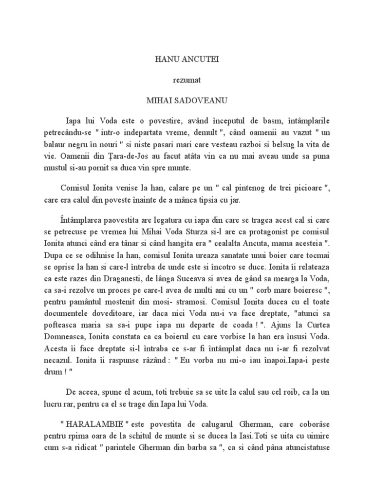 Mihail sadoveanu hanul ancutei rezumat pe scurt doc. Un comis (boier care se ingrijeste de hergheliile domnesti, dar hanul este un simbol, o cetate a spiritualitatii romanesti : Hanu ancuței este capodopera idilicului jovial și a subtilității barbare.