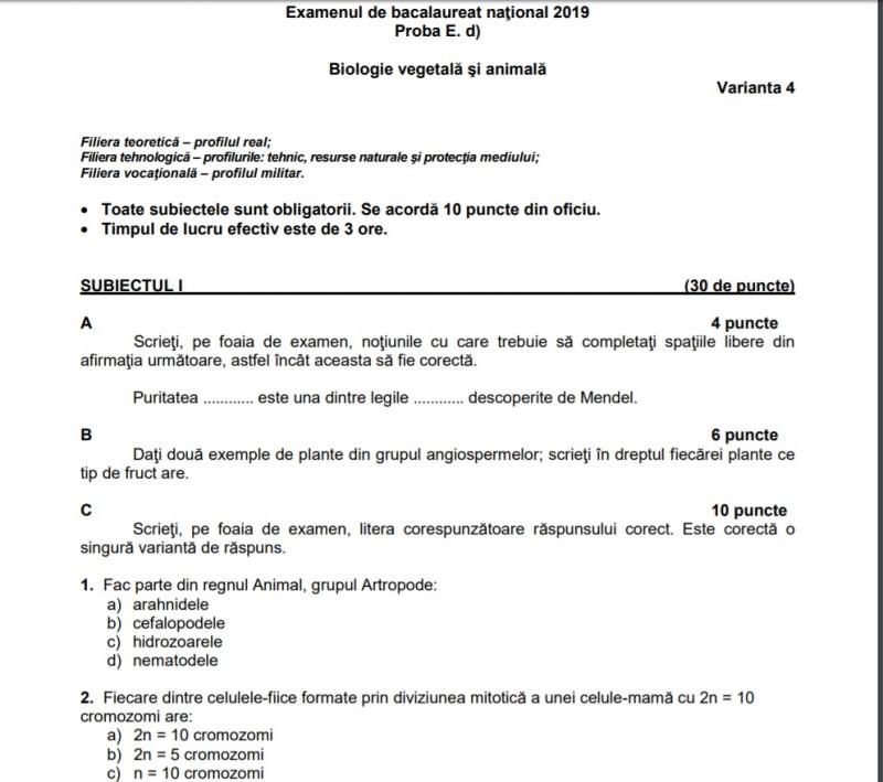 D) în funcţie de filieră, profil şi specializare. *sesiunea specială 2018 proba e.d) *jitaru ionel blog Simulare bac 2019 biologie edu.ro subiectele sunt elaborate de centrul naţional de evaluare şi examinare, în mod similar cu modelele publicate pe subiecte.edu.ro, şi sunt proiectate astfel încât tratarea lor să valorifice capacitatea elevilor de a dezvolta temele prevăzute în programa de examen şi parcurse până la această dată.